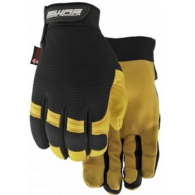 Dryhide™ water resistant full-grain goatskin leather palm is hard wearing and durable providing great dexterity. Spandex stretch back is flexible and provides form-fitting memory. Leather hooded fingertips and reinforced thumb for additional padding and protection. Snug-fitting elastic wrist and secure Velcro® closure keeps out dirt and debris.