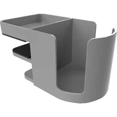 Conveniently holds your items steady and out of the way. Easily and securely clamps to side of desk, no tools needed. Adjusts to fit 3/4" to 2" flat rails. Protective cushioned pads are safe for desktop surfaces Cup Holder. Small tray provides quick access to clips or loose change. ABS. 4"W x 7"D x 3-1/2"H. Grey.