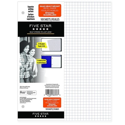 Five Star® quad refill paper is perfect for figuring, graphing and more. Each premium, heavyweight 24 lb. sheet is 3-hole punched and fits into a standard 3-ring binder. Paper measures 10-7/8” x 8-3/8”.