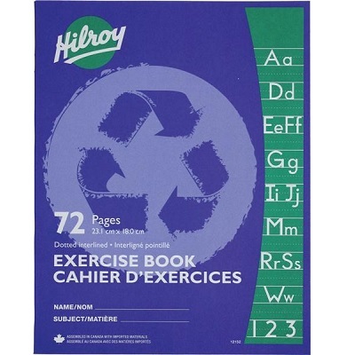 Hilroy® 72 page stitched recycled exercise books feature a different lightweight cover for different rulings. White paper. Paper and cover: 30% post-consumer waste. Purple cover has pages with dotted interline and margin.