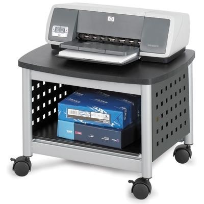Safco® Scoot™ printer stand features black powder coated steel for durability with silver leg accents and black laminate top. Unique hole pattern design. Mobile cart on four casters (two locking). 14-½" high for compact cart storage under desk or work surface. Capacity 100 lbs. Weighs 16 lbs. 20-1/4"Wx16-1/2"Dx14-1/2"H.