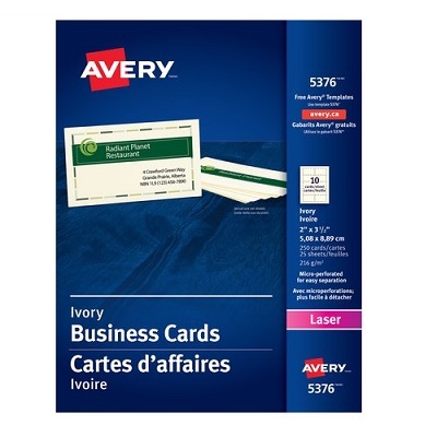 Make the right impression every time and create your own professional looking business cards. Avery® Business Cards for Laser Printers are the perfect solution for times when you instantly need to make title or address changes, cards for new employees, or customized messages. Heavyweight uncoated card stock is perfect for contact cards, appointment reminders, coupons, loyalty cards and more.
