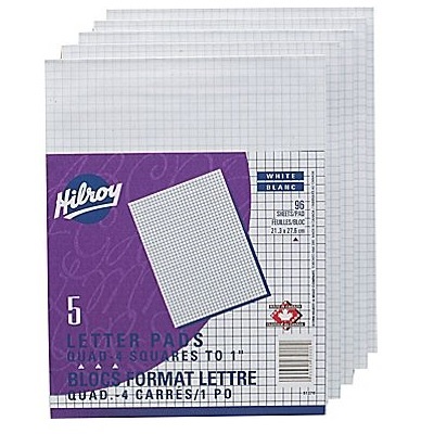 Hilroy® 8-3/8 X 10-7/8” pads with 15 lb. white paper and graph ruling, four squares to one inch. Clear gummed glued binding. Stiff backboard for writing support.