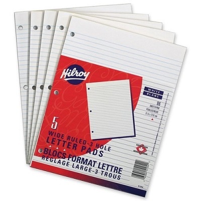 Hilroy® 8-3/8 X 10-7/8” pads with 15 lb. white paper and wide, 5/16” ruling. Clear gummed glued binding. Stiff backboard for writing support.