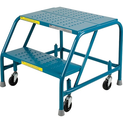 Kleton rolling step ladders are Ideal wherever there is a need to reach bulky materials. Rolls easily into position and locks firmly to the floor for maximum safety. 2 to 6 step ladders operate on spring-loaded casters. Casters retract under operator's weight, rubber feet drop down. Non-clogging slip-resistant steel steps. Frame is rugged welded 1" round steel tubing. Capacity: 300 lbs. Step Size: 22" W x 8" D. Top Step Size: 22" W x 16" D. Top Step Height: 19”. Base Dimensions: 24” x 26”. Weight: 32 lbs. Durable Kleton blue enamel finish. CSA certified to the ANSI A14.7 standard.