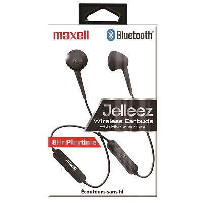 Maxell Jellez Wireless Earbuds with Mic. Soft rubberized on ear design for extended wear comfort fit Noise isolating earbuds with built in microphone. Bluetooth. Micro-USB charging cable. 8 hours playtime. Black.