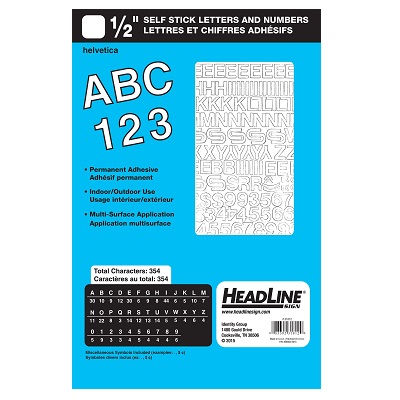Peel-and-stick vinyl letters and numbers. Permanent adhesive. Great for indoor and outdoor use. Waterproof.
